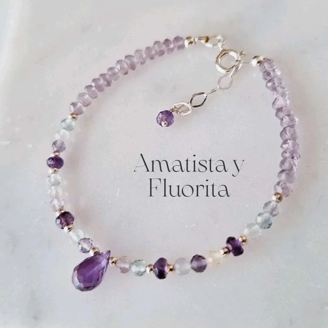Las piedras de amatista son de una calidad excepcionalmente alta, grado AAA, y se alternan con cuentas de fluorita dandole esa magia unica.