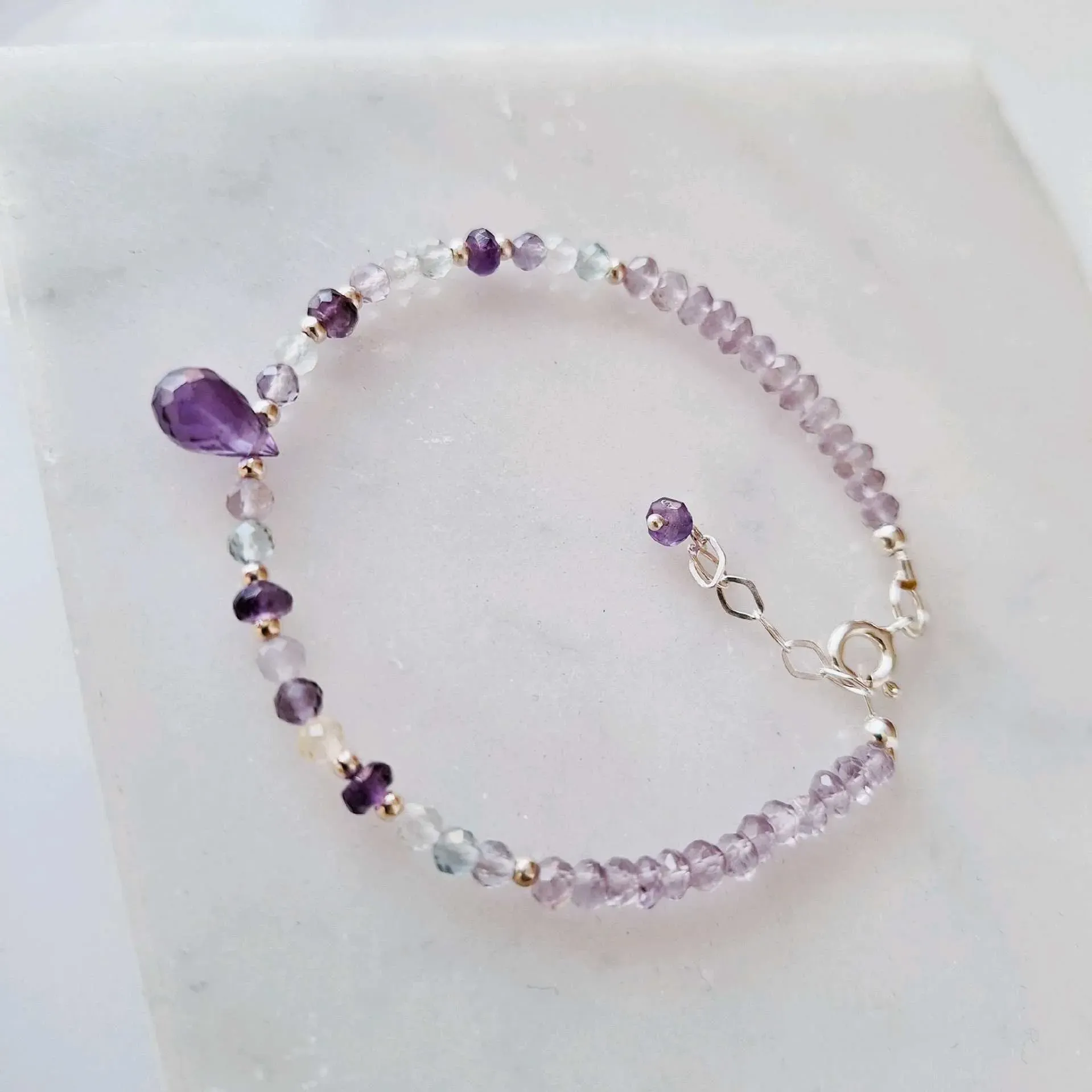 Las cuentas de amatista de color violeta intenso están talladas en facetas para lograr el máximo brillo en esta elegante pulsera.
